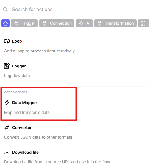 2. Navigate to the side panel and from the list of available flow components, select "Data Mapper." This will allow you to reshape your data as needed for your specific flow requirements.&#x20;